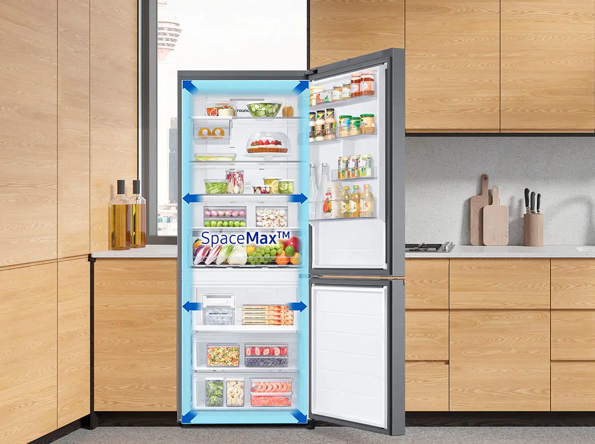 Stockez plus de nourriture dans un très grand réfrigérateur de 538 litres avec une profondeur de 711 mm. L’isolation à haut rendement de la technologie SpaceMax™ rend les murs beaucoup plus minces. Il crée ainsi plus d’espace de rangement, sans dépasser de votre surface de travail.