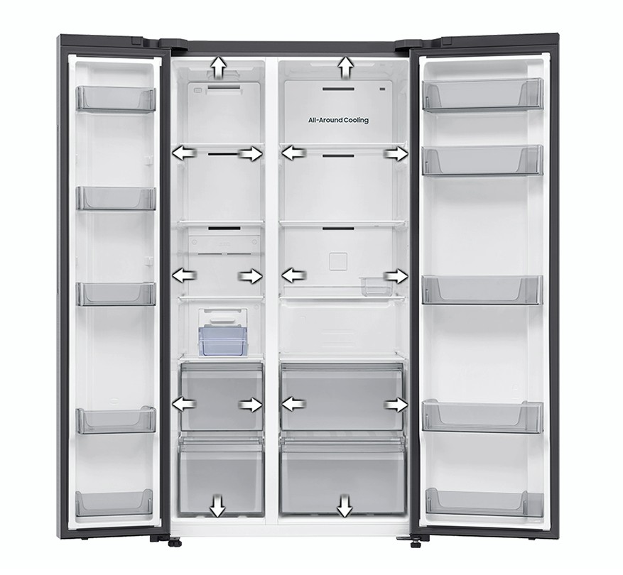Assurez-vous que les aliments sont correctement refroidis, où qu’ils se trouvent. Le refroidissement complet refroidit chaque compartiment uniformément d’un coin à l’autre, de sorte que tout est maintenu à la bonne température. Il vérifie en permanence la température et fait circuler l’air frais partout dans le réfrigérateur par des bouches d’aération stratégiquement placées.